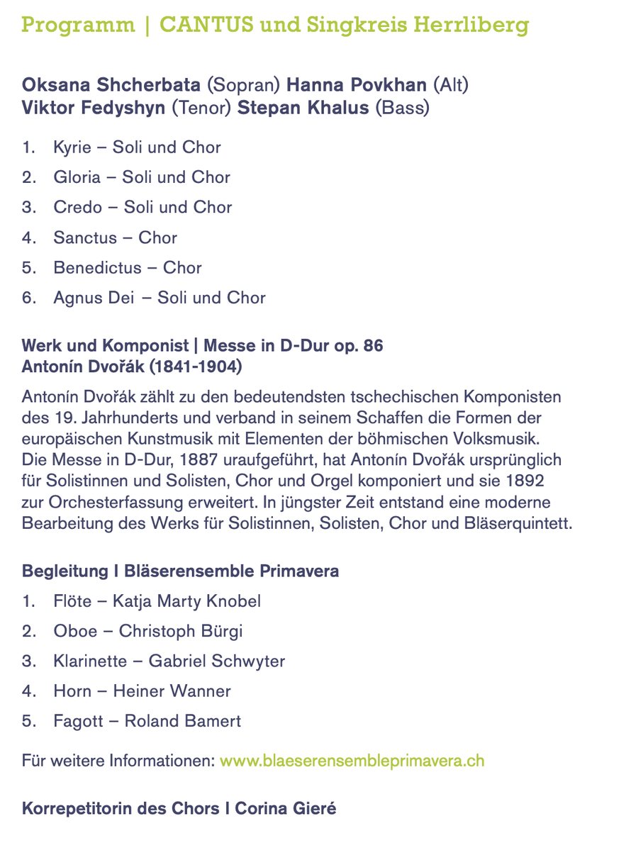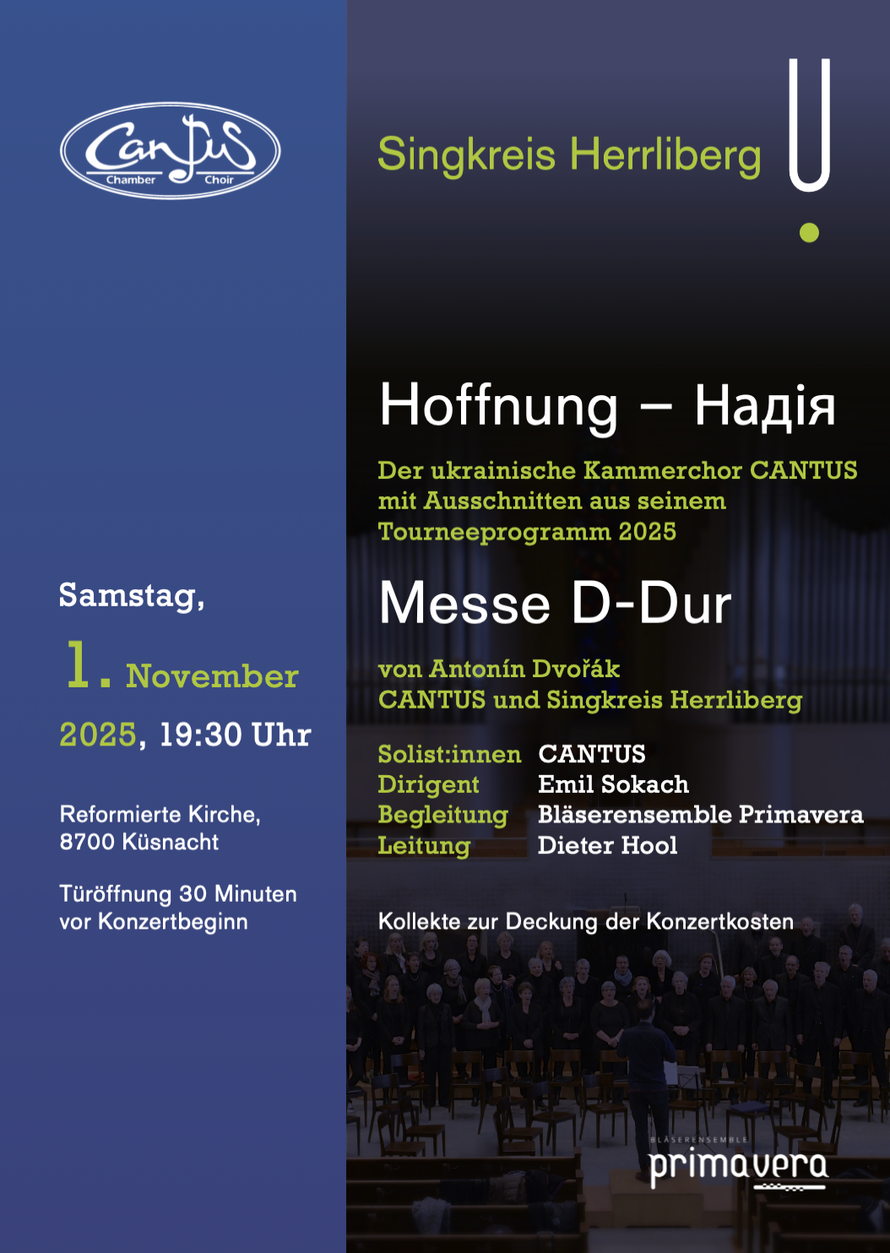 Am 1. November 2025 führen wir mit dem Singkreis Herrliberg und dem ukrainischen Profi-Kammerchor CANTUS die D-Dur-Messe von Antonín Dvořák auf, für Chor und Bläserquintett.